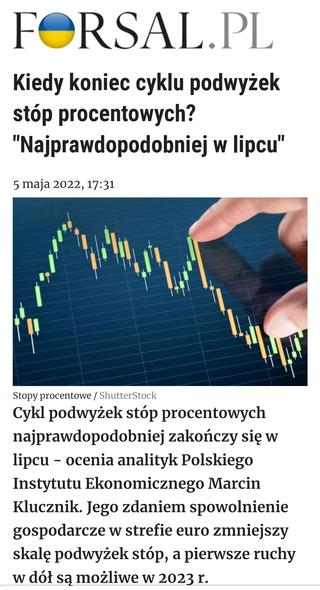 Serwis Forsal.pl cytuje Pana Marcina Klucznika – analityka Polskiego Instytutu Ekonomicznego, który twierdzi, że zakończenie cyklu podwyżek stóp procentowych miałoby nastąpić już w lipcu, a skalę podwyżek może zmniejszyć spowolnienie gospodarcze w strefie euro. Coraz więcej odczytów wskaźników ekonomicznych wskazuje również na słabnącą gospodarkę Stanów Zjednoczonych. W przyszłym roku spodziewane jest ostre hamowanie wynikające m.in. ze słabnącego popytu. Rosną obawy o możliwość stagflacji, czyli wyjątkowo niekorzystnego połączenia wysokiej inflacji ze stagnacją gospodarczą.