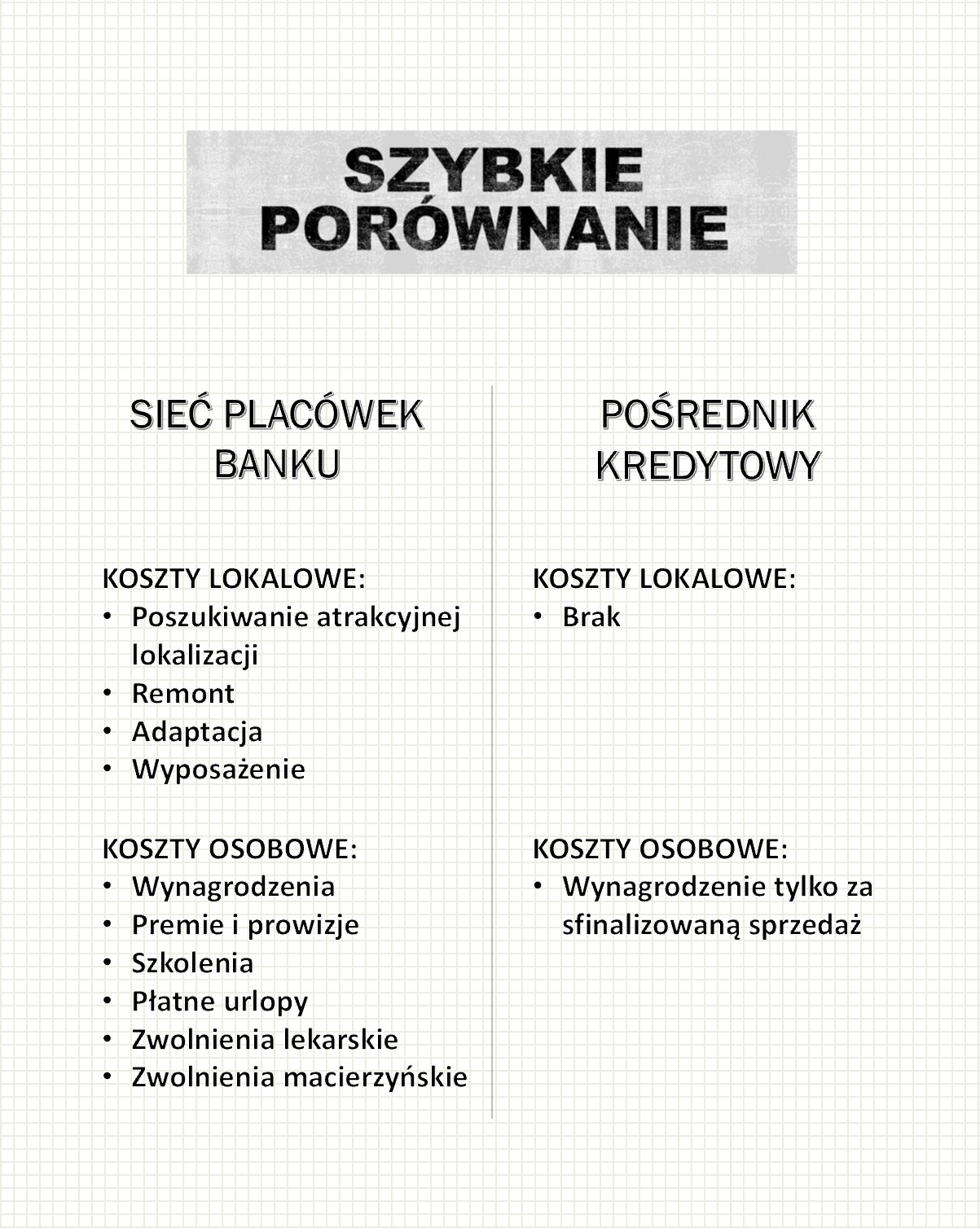 Współpraca z pośrednikami oparta jest na formule B2B zamiast o umowy o pracę, co zrzuca z banków ciężar wszystkich obowiązków wynikających z prawa pracy (urlopy, zwolnienia, szkolenia BHP, itp.)