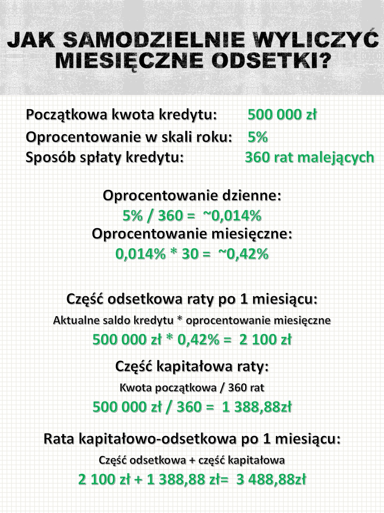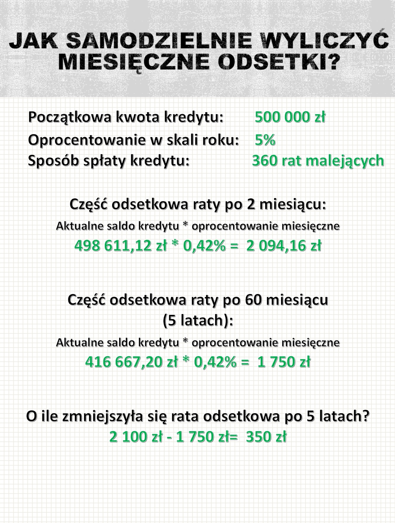 Zastanawiacie się pewnie dlaczego w powyższym przykładzie użyłem kredytu spłacanego w systemie rat malejących? Co z kredytami spłacanymi w ratach równych? Mechanizm wyliczania odsetek jest identyczny. Różnica polega na tym, że część kapitałowa jest tak wyliczana, aby zwiększała się wraz ze zmniejszającą się częścią odsetkową. Jest to znacznie bardziej skomplikowane obliczenie (wzór prezentuję poniżej) i nie chciałem niepotrzebnie komplikować powyższego przykładu.